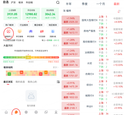 在APP,找到【自选】界面,找到【最强风口】,可以看到当日热点板块以及强度。