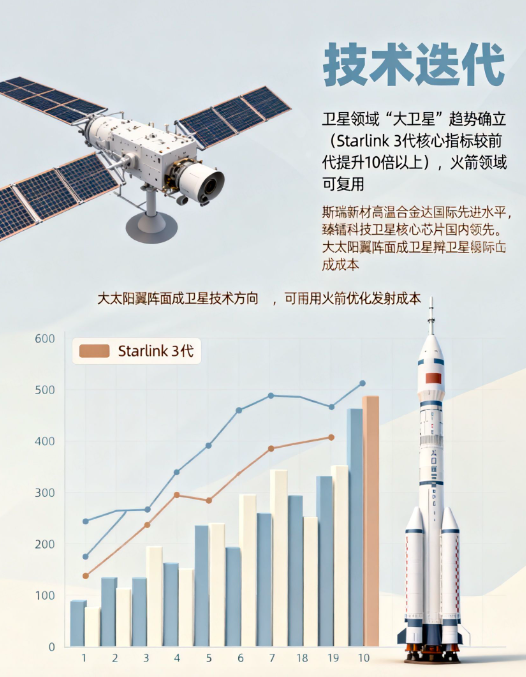 技术升级核心趋势:大太阳翼阵面成卫星技术方向,可复用火箭优化发射成本,上游材料与芯片保障自主可控。