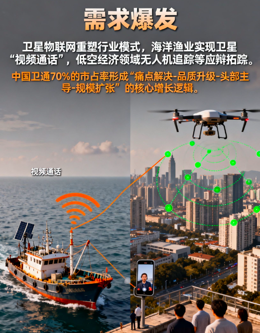 卫星物联网重塑行业模式,推动需求从“有没有”向“好不好”升级。海洋渔业实现卫星“视频通话”,解决远洋通信痛点;低空经济领域无人机追踪等应用快速拓展。