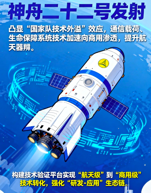 神舟二十二号发射凸显“国家队技术外溢”效应,其通信载荷、生命保障系统技术加速向商用渗透,提升航天器数据回传效率,推动卫星物联网场景落地。