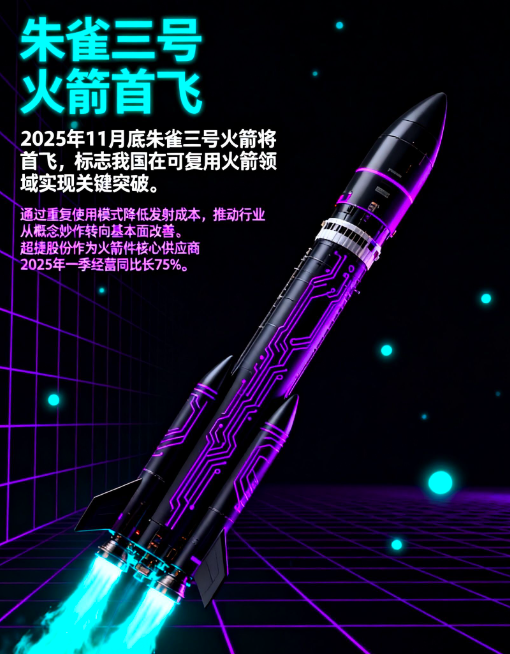 2025年11月底,朱雀三号火箭将首飞,标志我国商业航天在可复用火箭领域实现关键突破。其以成本控制为核心技术路径,通过重复使用模式降低发射成本,推动行业从概念炒作转向基本面改善。