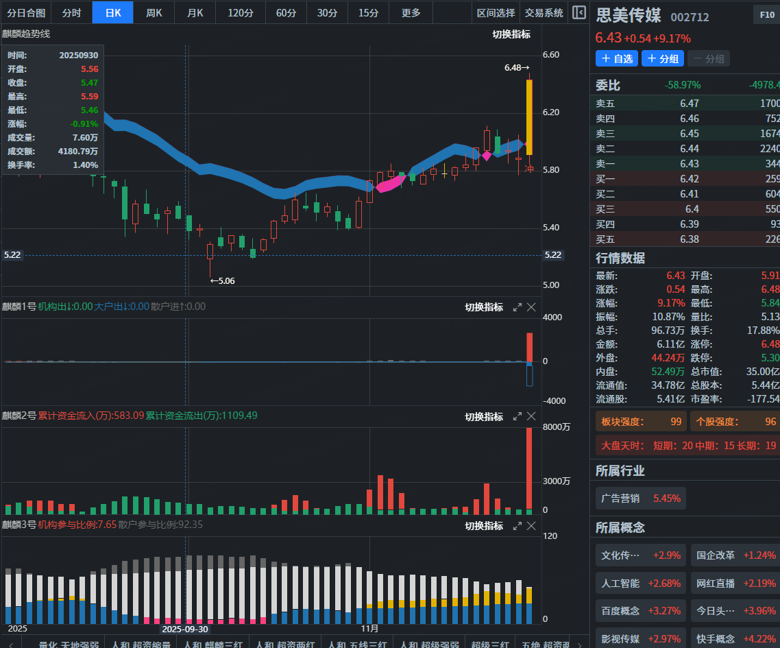 盘后预选结合天时,趋势,形态,指标,以及板块和个股强度来进行多维对比选择,能辅助选出有主力资金参与的股票,增加我们的成功率 指标能辅助选出有主力资金参与的股票,增加我们的成功率。但是需要明天结合AI 量化盘中确认功能结合个股强调进行甄别选择。