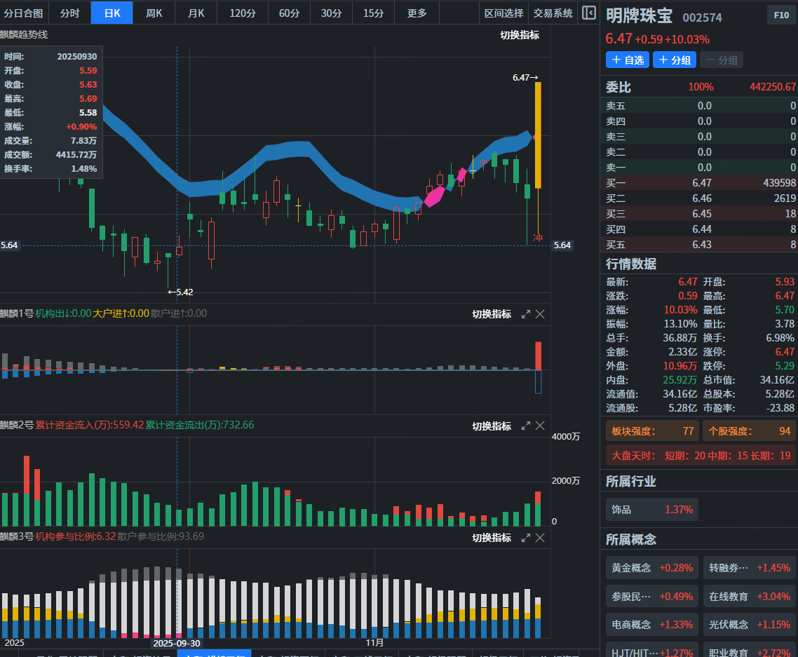 该股经过两个多月横盘震荡之后,今日日线低位大阳穿麒麟,个股强度98,结合上麒麟指标1号主力牢牢控盘,2号资金净流入,3号目前机构持仓比例不断增加,控盘度有所增加,结合战法规则,明天我们通过盘中确认功能结合个股强度,寻找合适参与机会。