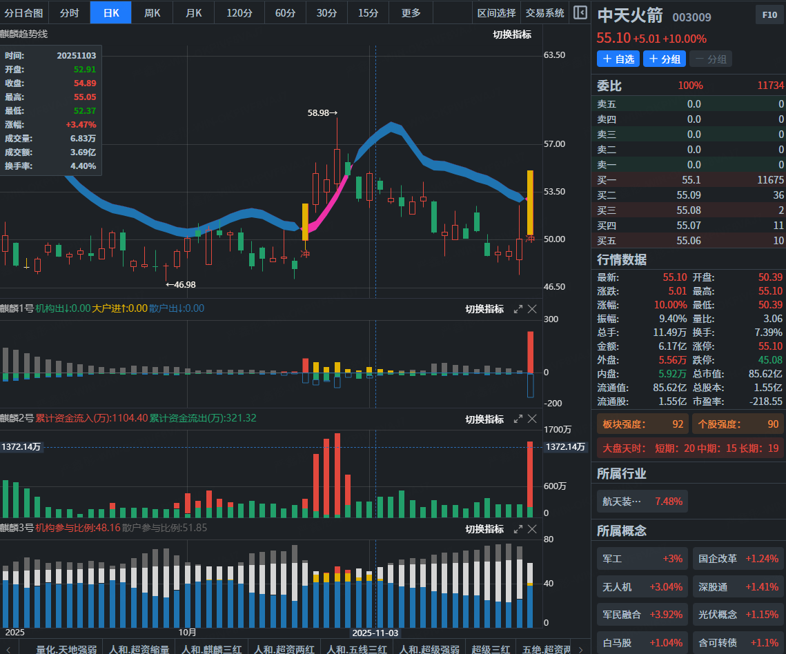 该股经过两个月横盘震荡之后,今日日线再次低位大阳穿麒,个股强度97,结合上麒麟指标1号主力牢牢控盘,2号资金净流入,3号目前机构持仓比例不断增加,结合战法规则,明天我们通过盘中确认功能结合个股强度,寻找合适参与机会。
