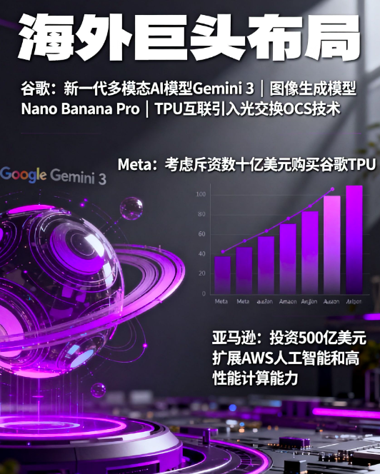 海外方面,谷歌近期发布新一代多模态AI模型Gemini 3和图像生成模型Nano Banana Pro,引发市场高度关注。更重要的是,谷歌在TPU互联中引入光交换OCS技术,构建由多个机柜组成的TPU超节点。据谷歌AI基础设施负责人Amin Vahdat透露,公司必须每6个月将AI算力翻倍,并在未来4到5年内额外实现1000倍的增长。
