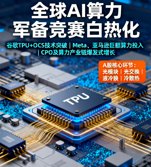 全球AI算力军备竞赛进入白热化阶段,谷歌TPU+OCS技术突破与Meta、亚马逊等巨头的巨额算力投入,正推动CPO及算力产业链迎来爆发式增长。A股市场中,光模块、光交换、液冷散热等核心环节龙头企业已显强势,行业景气度持续攀升。