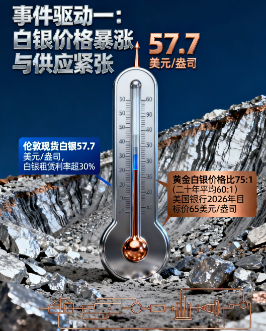 更夸张的是白银租赁利率,最近直接飙升到30%以上,什么意思?就是你想借白银来做空,光租金就要付30%,这说明市场上白银已经紧张到什么程度!有分析说现在黄金白银价格比是75:1,比过去二十年平均的60:1高出一大截,美国银行干脆把2026年白银目标价上调到65美元/盎司。