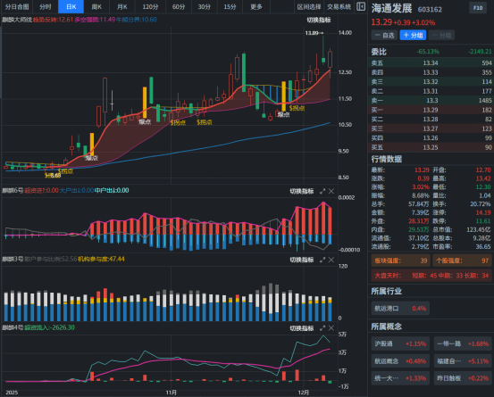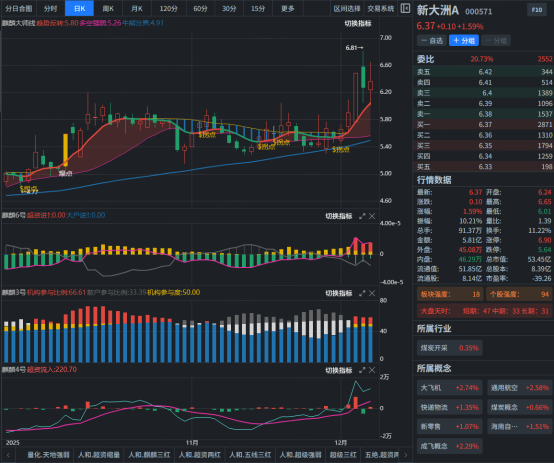 该股股价从10月14日阶段波段出高点6.20以来,进入震荡横盘走势,期间有4个拐点K线形态,近期表现出抗跌特征并创阶段新高,实现三期共振向上;板块强度18而个股强度94;结合麒麟指标6号持续红柱,表明得到主力资金的认同且达到高度控盘特征;3号显示机构持仓比例超过5成,4号显示超资频繁翻红;结合战法规则,短期我们可考虑回踩靠近红线,通过盘中确认功能结合个股强度,寻找合适参与机会。
