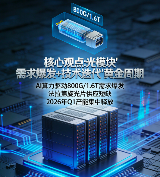 光模块行业正处于“需求爆发+技术迭代”的黄金周期!在微软、英伟达300亿美元算力合作的催化下,800G/1.6T光模块需求呈现爆发式增长,而光隔离器核心材料法拉第旋光片的全球短缺,使具备核心技术壁垒的企业迎来量价齐升机遇。国盛证券指出,2026年一季度光模块行业将迎来产能集中释放,叠加硅光技术突破,头部厂商业绩确定性极强。(老师最近一直在强调光模块方向的机会,大家可以查看栏目历史文章回顾)。