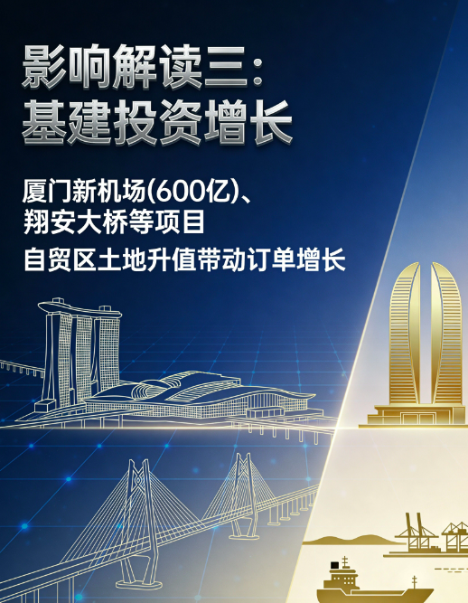 受益逻辑: - 厦门国贸、建发股份等企业参与基建项目,订单增长确定性强 - 自贸区扩容带动土地升值,厦门港务、漳州发展等土地储备丰富企业受益 - 台商投资区建设提速,龙洲股份、福建金森等本地基建企业需求增加