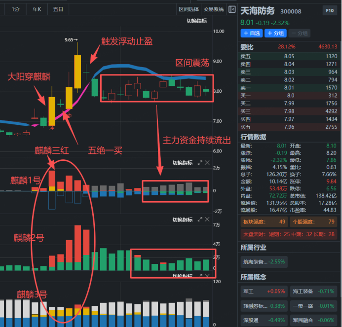 现在咱们套到天海防务上看:这只股 11 月 19 日出现了 “大阳穿麒麟”,趋势反转,之后给了 “五绝一买” 的机会,连续两天大涨,盈利超 20%,后来股价回撤 5%,触发浮动止盈就该出局了。现在股价一直在区间震荡,还被麒麟趋势线压着,再看资金面,麒麟 1 号、2 号都是绿色柱,说明主力资金一直在往外流。