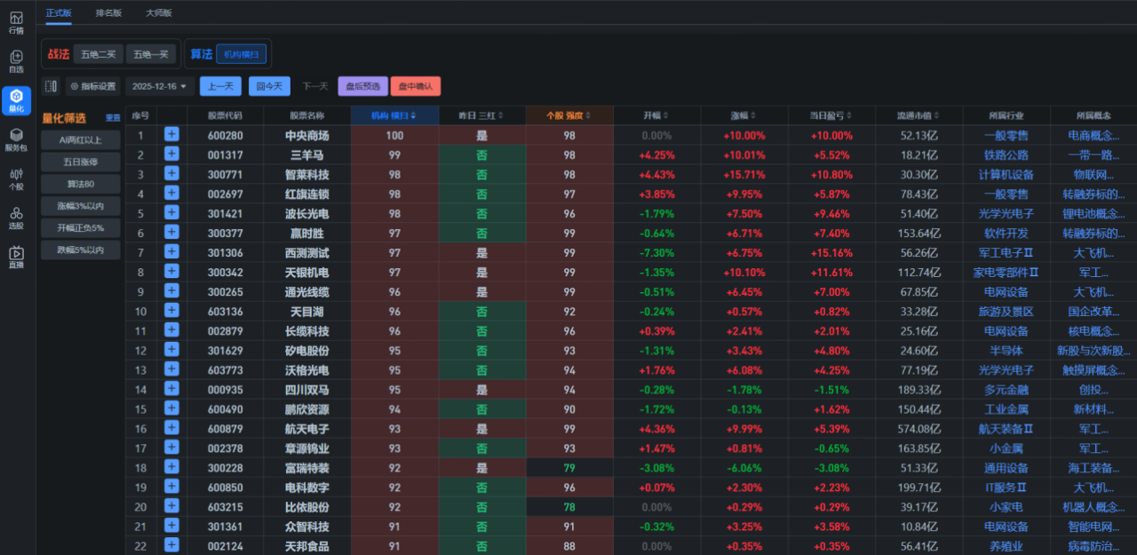 从AI量化给的数据来看,今天三大指数低开全天震荡走低,截至收盘三大指数均大幅收跌,仅大消费等少数几个方向逆势走强,再次出现普跌态势,市场亏钱效应严重。从数据来看,虽然大盘整体亏钱效应严重,但今天咱们五绝战法的赚钱效应仍不差,机构横扫大于80分个股的当日盈亏收红和收绿的家数是差不多的。从赚钱效应集中方向来看,今天主要集中在大消费方向。总体上来看,今天仅大消费方向逆势走强,无人驾驶、数字货币、商业航天等少数板块盘中表现活跃外,其它板块均大幅调整,沪指跌破震荡区间,若后市不能快速放量反弹走强修复,则大盘或继续震荡探底。