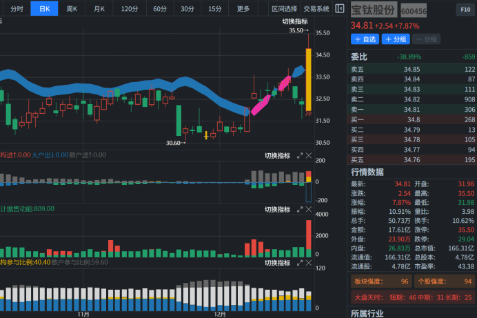 个股基本面亮点:公司是中国最大的以钛为主导产品的稀有金属材料专业化生产、科研基地,中国市场占有率在40%以上,其中高档钛材和军工钛材市场占有率高达80%以上。