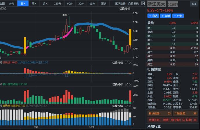 该股前面持续震荡, 形态持续调整接近1个多月之久,今日日线再次大阳穿麒麟,板块强度45,个股强度29,结合上麒麟指标1号红,2号资金净流入,3号目前机构持仓比例不断增加,盘后预选内参案例作为教学分享演练,不做直接推荐,同时新手建议学习为主