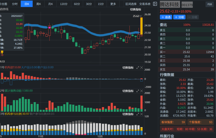 该股前面震荡修整, 形态上持续盘整震荡之后,今日日线再次大阳穿麒麟,板块强度53 个股强度86,结合上麒麟指标1号资金控盘,2号资金流入,3号目前机构持仓比例不断增加,盘后预选内参案例作为教学分享演练,不做直接推荐,同时新手建议学习为主。