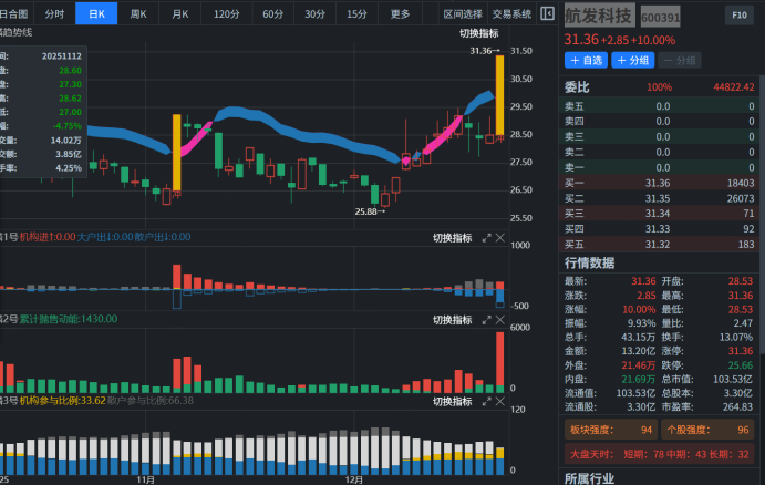 该股经过1个多月横盘震荡调整之后,今日日线大阳穿麒麟形成双剑合璧,板块强度94 个股强度96,结合上麒麟指标1号主力牢牢控盘,2号资金净流入,3号目前机构持仓比例不断增加,盘后预选内参案例作为教学分享演练,不做直接推荐,同时新手建议学习为主。