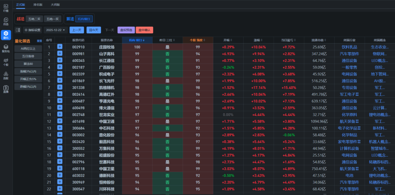 从AI量化给的数据来看,今天中小盘股和科技权重股均大幅走强,带动市场放量大涨,全市场近3000只个股上涨,整体赚钱效应非常好。从数据来看,在大盘赚钱效应较好的情况下,咱们五绝战法的赚钱效应也同样表现非常好。机构横扫大于80分个股的当日盈亏绝大部分收红从赚钱效应集中方向来看,今天主要集中在汽车零部件和通信设备方向。总体上来看,近期市场风格反复轮动,但总体上无外乎,就是大科技股和小消费股这两个方向轮动切换,即表现为所谓的板块行情间的此消彼长、跷跷板效应关系。毕竟科技股是市场的长期主线,后市应继续紧密关注科技股的机会。