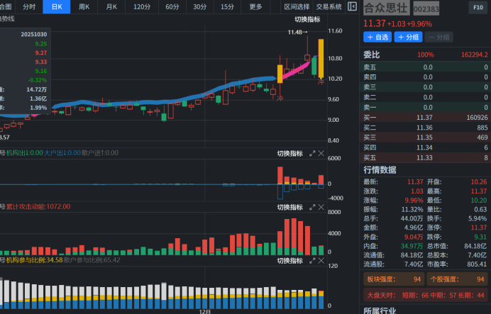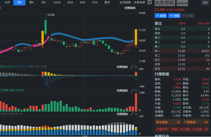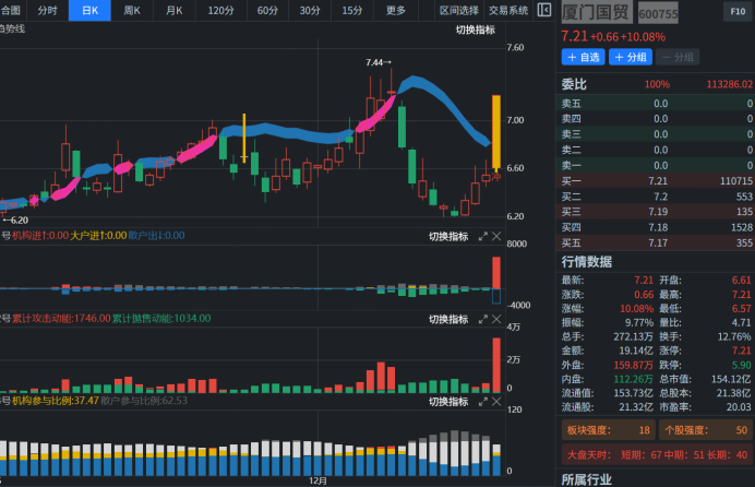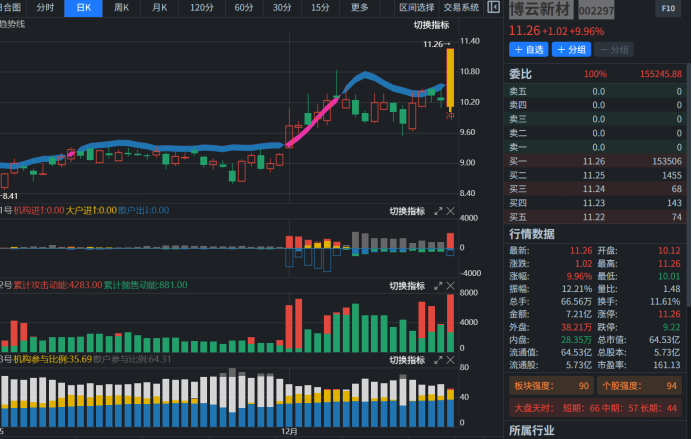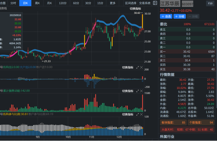 该股目前逐步上行,今日日线大阳穿麒麟形成双剑合璧,板块强度94个股强度94,结合上麒麟指标1号主力牢牢控盘,2号资金净流入,3号目前机构持仓比例不断增加,盘后预选内参案例作为教学分享演练,不做直接推荐,同时新手建议学习为主。