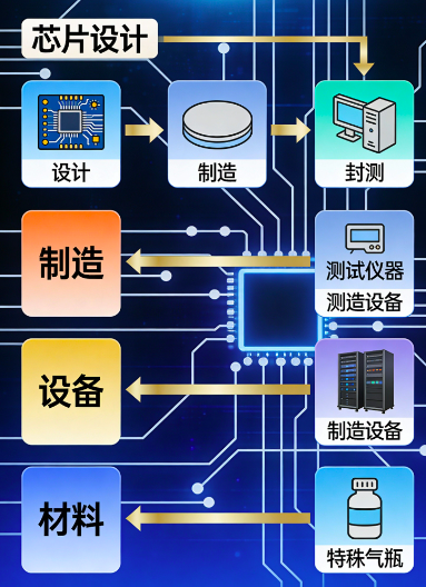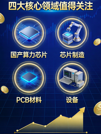 算力半导体产业链涵盖芯片设计、制造、封测、设备及材料等环节。当前投资机会集中在国产算力芯片、芯片制造、PCB材料及设备四大领域。