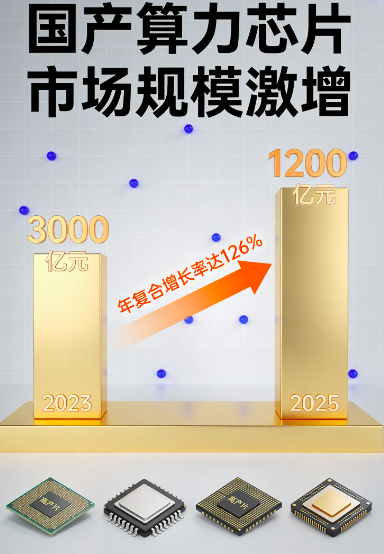 国产算力芯片市场规模从2023年的300亿元增至2025年的1200亿元,年复合增长率达126%。随着AI大模型训练需求增长,国产算力芯片出货量有望突破500万片。