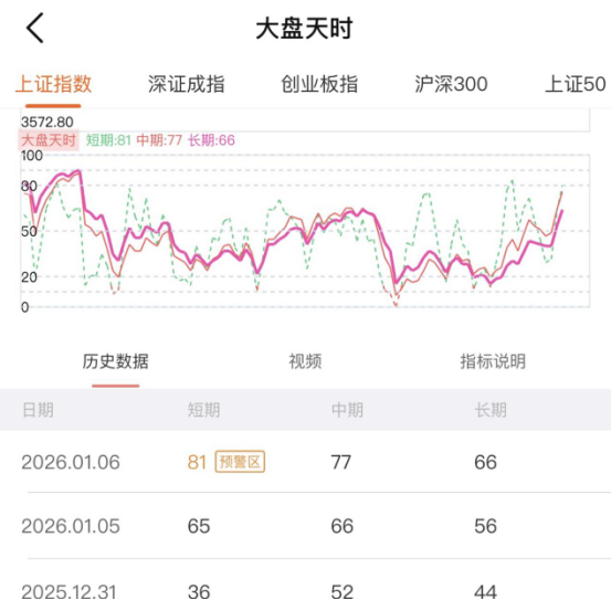 今天上证指数继续大涨,收出十三连阳。短线情绪指标从65上涨到81,短线情绪指标进入预警区域。中期情绪指标从66来到77,长期情绪指标从56上升到66。三大情绪指标继续上涨,整体市场情绪持续向好,但连续的大涨也要注意风险了。