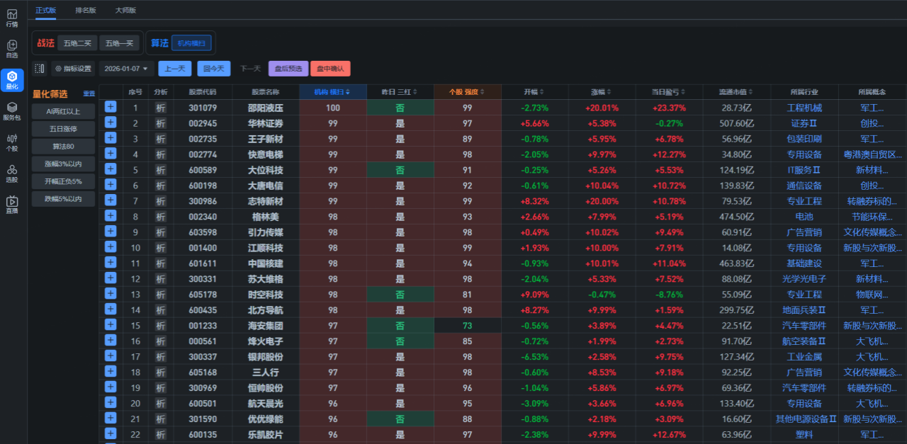 从AI量化给的数据来看,今天大盘延续强势全天震荡偏强,截至收盘三大指数均收红,但从涨跌家数来看,涨少跌多,全市场近3200只个股收跌,主要是因为上涨的个股涨幅较大,下跌的个股跌幅基本上在1%左右,这样综合来看虽然下跌家数多,但整体的平均涨跌幅仍是红的,整体赚钱效应仍偏好。从数据来看,今天咱们五绝战法的赚钱效应仍表现较好,机构横扫大于80分个股的当日盈亏绝大多数均大幅收红。从赚钱效应集中度来看,今天赚钱效应主要集中设备方向。总体上来看,今天大盘继续放量上涨,沪指连续14天收红,虽然今天只是收了根十字星,只要成交量在后市仍大概率继续震荡偏强,后市重点关注科技股交易机会。