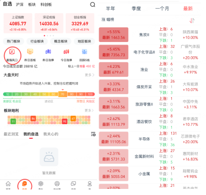 在APP,找到【自选】界面,找到【最强风口】,可以看到当日热点板块以及强度。