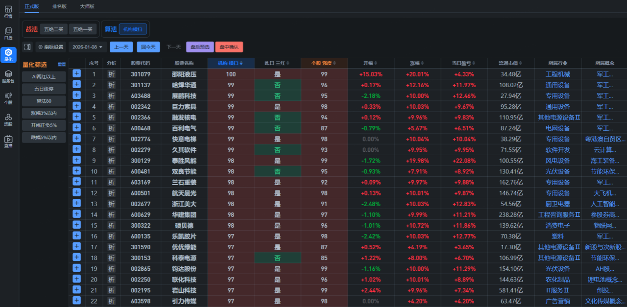 从AI量化给的数据来看,今天大盘全天窄幅震荡,截至收盘三大指数均小幅收绿,但从涨跌家数来看,仍有超3700只个股上涨,市场整体赚钱效应非常好;详细来看,今天是权重股偏弱,中小盘股普涨的态势。从数据来看,今天咱们五绝战法的赚钱效应仍表现较好,机构横扫大于80分个股的当日盈亏绝大多数均大幅收红。从赚钱效应集中度来看,今天赚钱效应主要是设备和军工方向。总体上来看,大盘连续收了两根十字星,多空处于均衡状态,后市要重点关注成交额,只要成交额维持高位,短期大幅回调概率不大,但也要有一定的防守意识,控制下仓位。