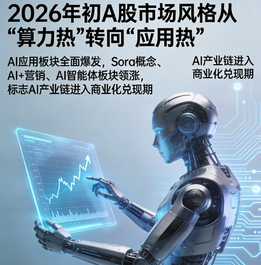 2026年初A股市场风格显著切换,此前强势的AI硬件(如光模块、服务器)回调,AI应用板块全面爆发——今天Sora概念、AI+营销、AI智能体板块领涨,易点天下、天龙集团等“20CM”涨停,蓝色光标单日成交额达193.2亿元居A股第一,新“易中天”组合(易点天下、视觉中国、天龙集团)成市场焦点。这一转变标志着AI产业链投资逻辑从“拼算力规模”向“赚应用红利”迁移,行业正式进入商业化兑现期。