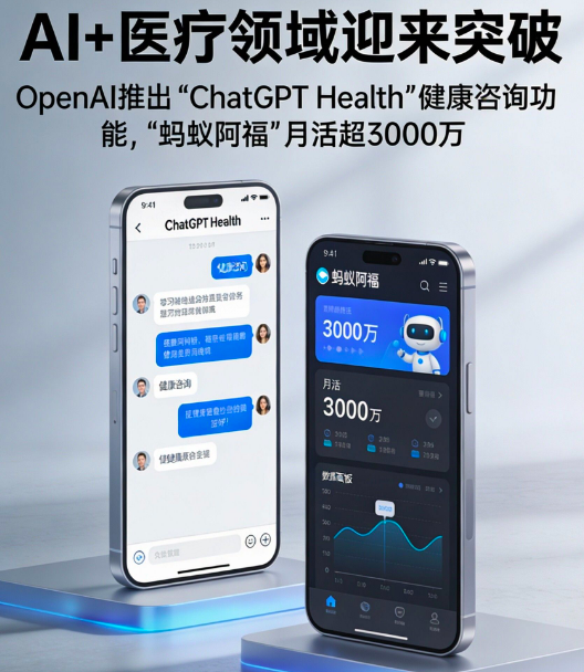 • AI+医疗:1月8日OpenAI推出“ChatGPT Health”健康咨询功能,同期“蚂蚁阿福”月活超3000万,日均回答健康提问1000万次,美年健康、卫宁健康等企业加速布局AI医疗服务。