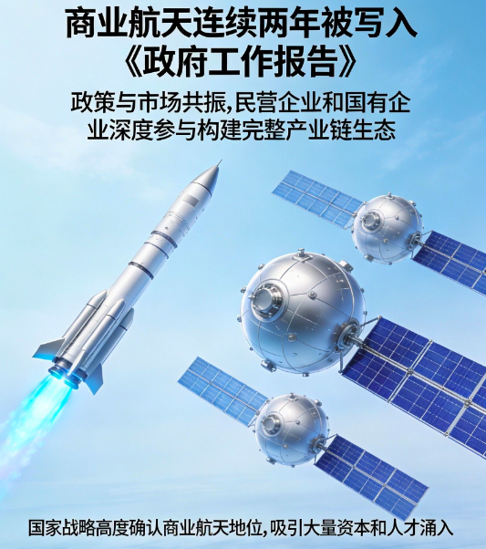 商业航天连续两年被写入《政府工作报告》,国家层面的战略定位为产业发展提供了坚实保障。同时,民营企业的快速崛起与国有企业的深度参与形成共振,构建了完整的产业链生态。