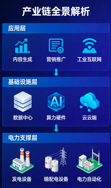 - 基础设施层:数据中心、算力硬件、云计算