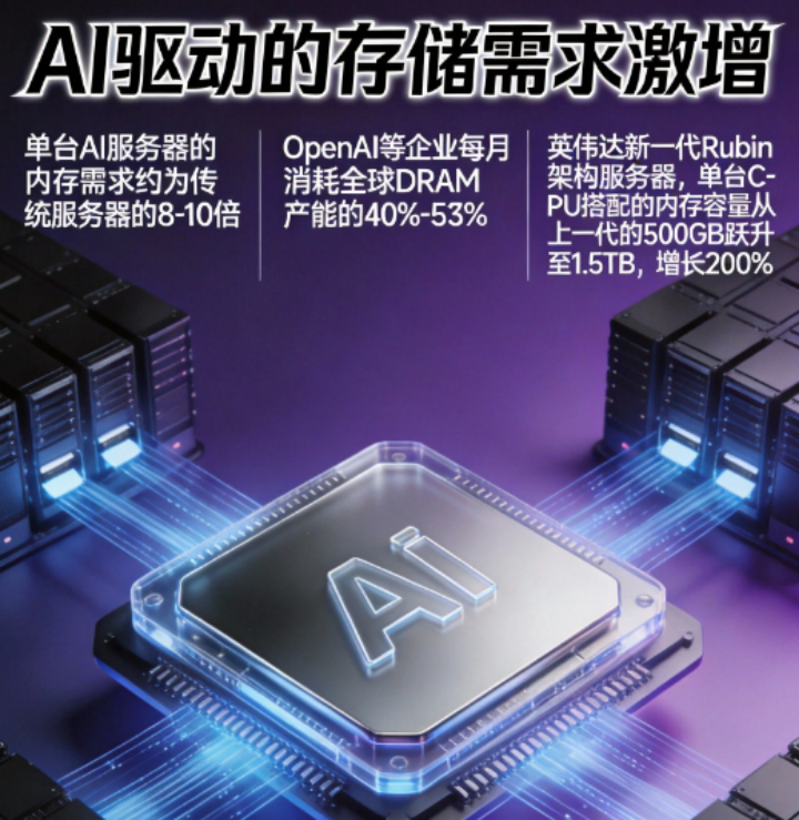 当前AI大模型的训练和推理对存储的需求呈现快速增长态势。单台AI服务器的内存需求约为传统服务器的8-10倍,OpenAI等企业每月消耗全球DRAM产能的40%-53%。