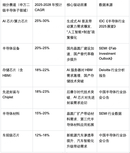 根据IDC、德勤(Deloitte)、国际半导体产业协会(SEMI)等权威机构的数据,未来3-5年行业核心细分领域的增速如下: