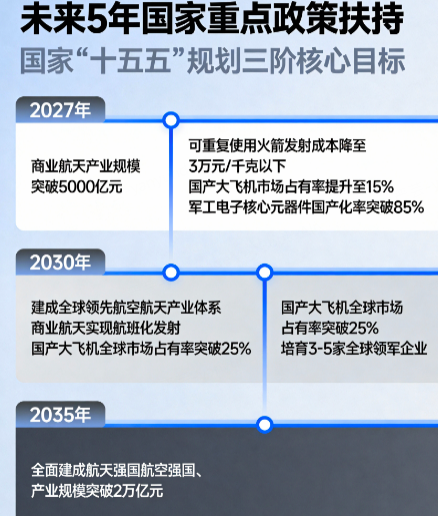 • 2035年:全面建成航天强国、航空强国,航空航天产业规模突破2万亿元(数据来源:国家“十五五”规划纲要、国家航天局政策文件)。
