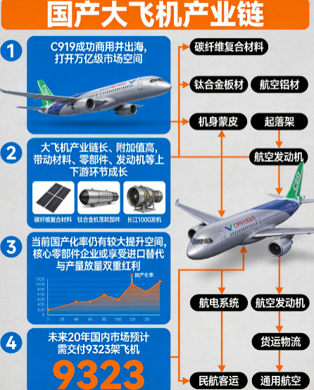 逻辑:C919成功商用并出海,打开万亿级市场空间。大飞机产业链长、附加值高,带动材料、零部件、发动机等上下游环节成长。当前国产化率仍有较大提升空间,核心零部件企业或享受进口替代与产量放量双重红利。