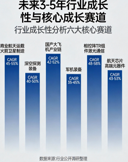 未来3-5年,航空航天行业作为国家战略性新兴产业核心引擎,在全球军费上涨周期、军民融合深化及商业航天爆发的多重驱动下,呈现“军工筑牢基本盘、商用打开增长极”的发展格局,整体年均复合增长率预计达35%-45%。
