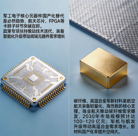 逻辑:碳纤维、高温合金等新材料是航空航天装备轻量化、高性能的核心支撑。商业航天推动碳纤维需求爆发,2030年市场规模预计达100-120亿元;军机与航发升级带动高温合金需求增长。新材料国产化率提升空间大,具备产能与技术优势的企业或受益。