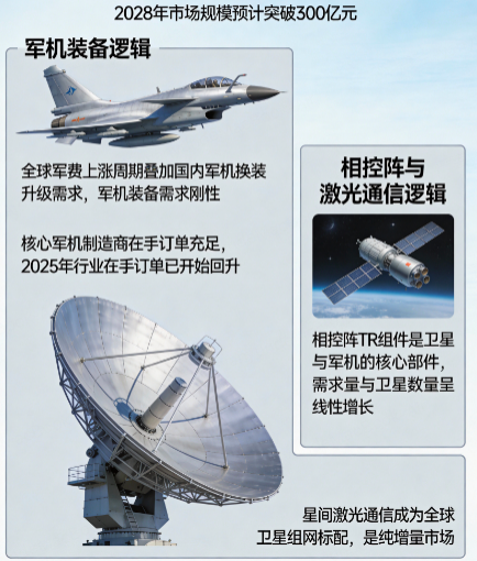 逻辑:相控阵T/R组件是卫星与军机的核心部件,需求量与卫星数量呈线性增长;星间激光通信成为全球卫星组网标配,是纯增量市场。2028年市场规模预计突破300亿元,赛道内具备核心技术壁垒的企业或充分受益。