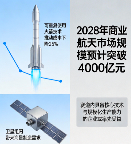 逻辑:商业航天正从“技术验证”向“规模化组网”跨越,运载火箭与卫星制造需求爆发。可重复使用火箭技术推动成本下降25%,卫星组网带来海量制造需求,2028年商业航天市场规模预计突破4000亿元。赛道内具备核心技术与规模化生产能力的企业或率先受益。