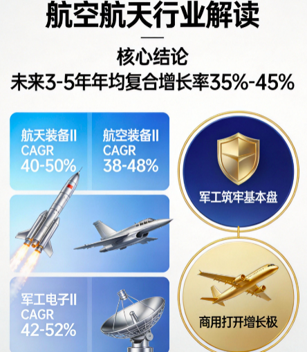 其中申万二级行业航天装备Ⅱ(含运载火箭、卫星制造等)CAGR可达40%-50%;航空装备Ⅱ(含军机、民机等)CAGR可达38%-48%;军工电子Ⅱ(含相控阵组件、航天芯片等)CAGR高达42%-52%。核心成长方向包括商业航天核心装备、国产大飞机产业链、军机核心装备、相控阵与激光通信等领域,需关注技术验证不及预期、供应链质量管控、订单交付延迟及国际竞争加剧等行业共性风险。