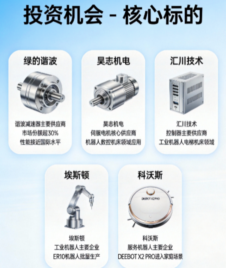 • 核心零部件:关注谐波减速器、伺服电机、行星减速器、传感器、控制器等领域的重点企业,如绿的谐波、昊志机电、汇川技术等。