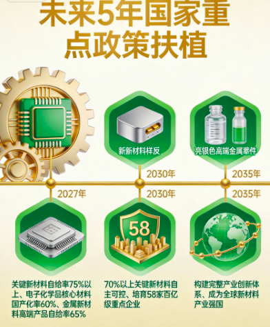 • 2030年:实现70%以上关键新材料的自主可控,培育出58家有国际竞争力、年营收超百亿的重点企业;