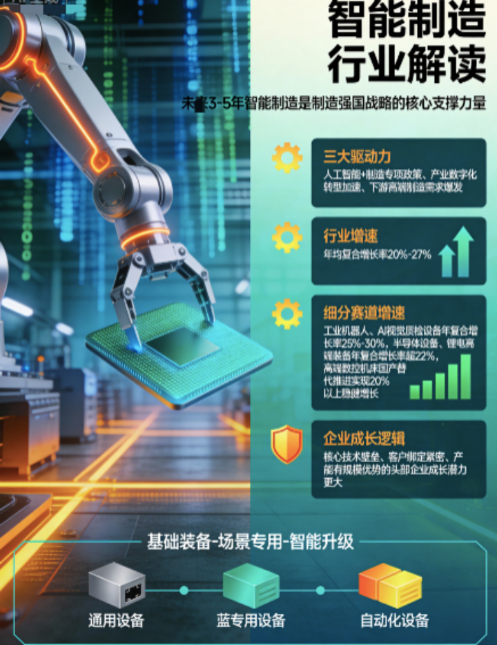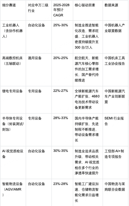 核心逻辑清晰:通用设备是智能制造的基础支撑,专用设备深度绑定下游高景气赛道,自动化设备是智能化转型的核心载体,三者相互配合,形成了“基础装备升级→专用装备配套→自动化系统集成”的完整增长循环(分析基于公开的行业数据)。