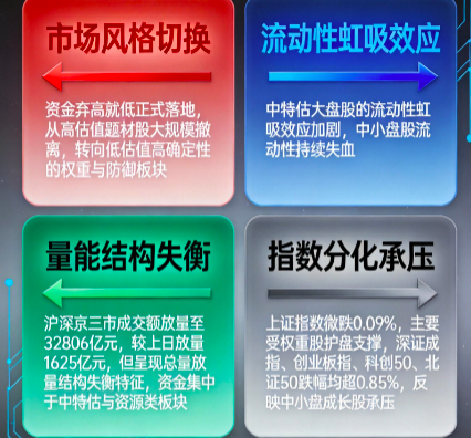 1. 市场风格切换:资金"弃高就低"正式落地,从高估值题材股大规模撤离,转向低估值、高确定性的权重与防御板块。中特估大盘股的流动性虹吸效应加剧,中小盘股流动性持续失血。