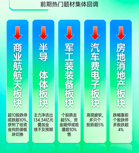 商业航天板块:领跌两市,超10股跌停或跌超10%,相关个股跌幅居前。前期涨幅较大后获利了结,资金从高位题材向防御板块切换。