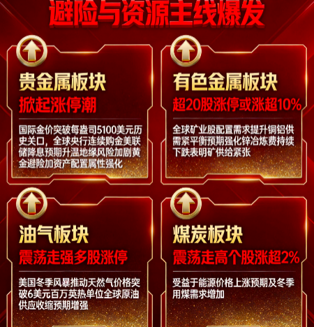 贵金属板块:掀起涨停潮,成为当日市场核心亮点。相关个股多数涨停,核心驱动因素包括:国际金价突破每盎司5100美元历史关口;全球央行连续购金、美联储降息预期升温、地缘风险加剧,黄金"避险+资产配置"属性强化。