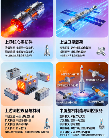 1. 核心零部件:火箭发动机、卫星载荷、测控设备、材料等核心零部件领域的相关企业,如蓝箭航天、长光卫星、中国卫通等,其发展与对应零部件需求态势相关。