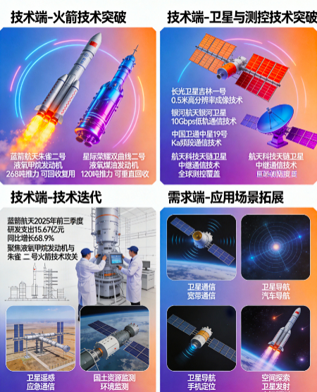4. 技术迭代:商业航天企业持续加大研发投入,蓝箭航天2025年前三季度研发支出同比增长68.9%至15.67亿元,聚焦液氧甲烷发动机、朱雀二号火箭等产品的技术攻关。
