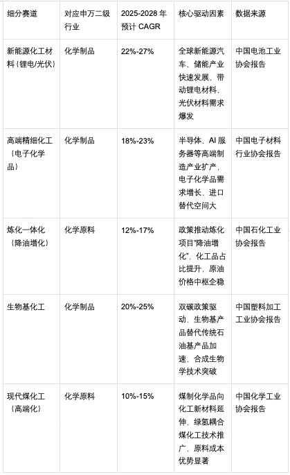 其中申万二级行业化学原料(含炼化、煤化工等)靠着原油中枢企稳、产能出清还有新能源材料原料需求增长,CAGR能有10%-15%;化学制品(含新能源化工材料、高端精细化工等)靠着新能源、半导体这些终端高景气赛道,CAGR高达15%-20%,细分高景气赛道增速超20%。